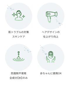 全成分[水]のみの為、髪や肌をはじめ全身いたる所に使え低刺激で、赤ちゃんにも お使い頂けます